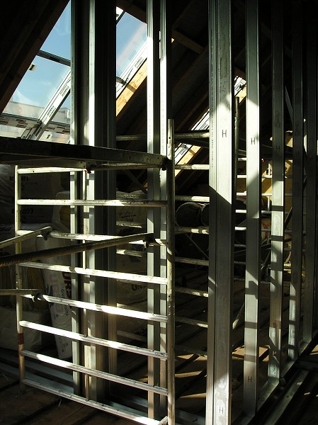 Popis: v 5.NP domu se začínají stavět příčky jednotlivých místností bytů