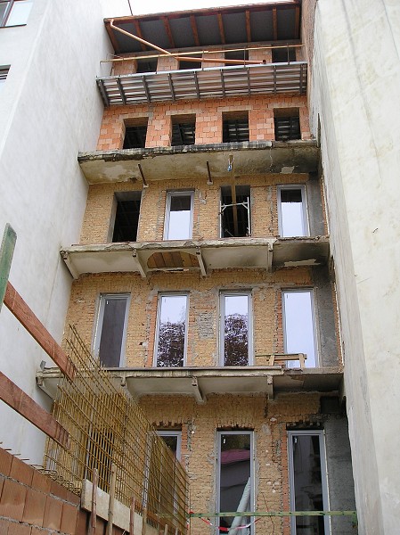 Popis: do dvorní fasády domu se instalují nová okna a dveře na lodžie bytů