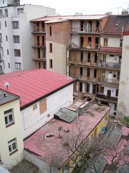 Popis: pohled na budovu sboru a domu z učebny školy v Belgické ulici