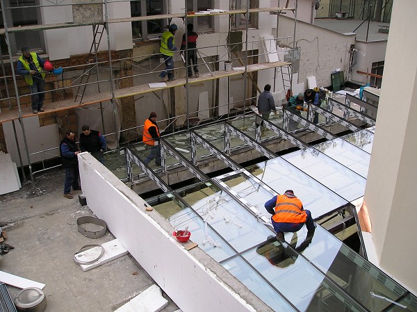 kladení skleněných tabulí na konstrukci střechy atria 3. února 2009 15:05:35