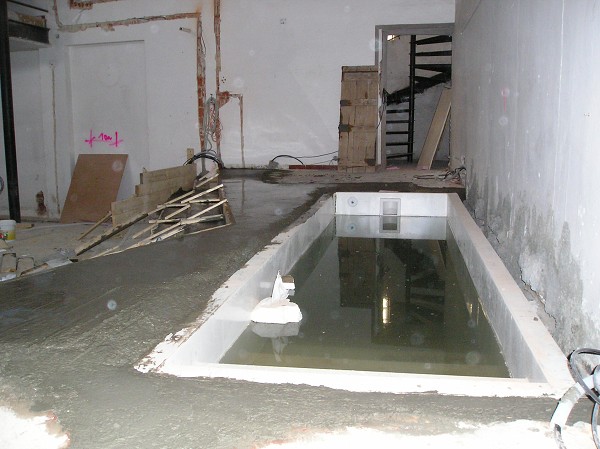 nová křtitelnice zasazená do schodiště modlitebny sálu 19.3.2009