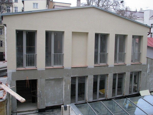 čelní stěna sboru je již osazena čtveřicí dveří na balkon sboru a zábradlím oken bytu kazatele ve 3.NP sboru 1.4.2009