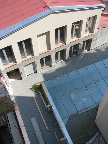 pohled ze 6.NP domu na čelní stěnu sboru a ochoz atria 14.4.2009