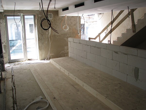 dřevěná tesařská konstrukce "schodiště" lavic na balkonu sboru 14.4.2009