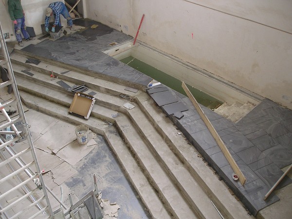 dokončuje se pokládka keramické dlažby schodiště sálu modlitebny sboru 13.5.2009
