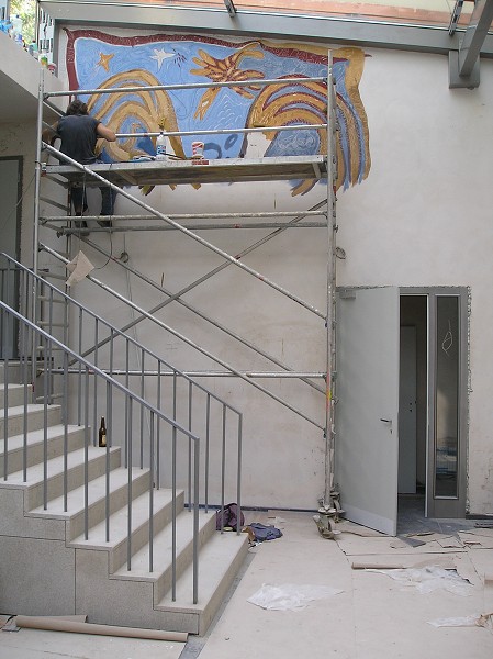 pan Vorel, autor tělesa kazatelny, začal se svým pomocníkem práce na uměleckém ztvárnění podoby atria sboru 26.5.2009